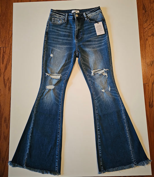 HIGH RISE SUPER FLARE DISTRESSED JEANS