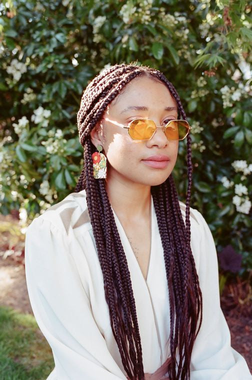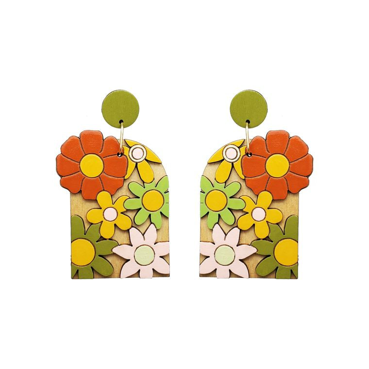 From our newest collection where geometric shapes transform into organic floral designs meet our 70s Floral Arch Earrings! These earrings were hand-painted then glued with a thin layers of wood to create dimension through shapes and colors.