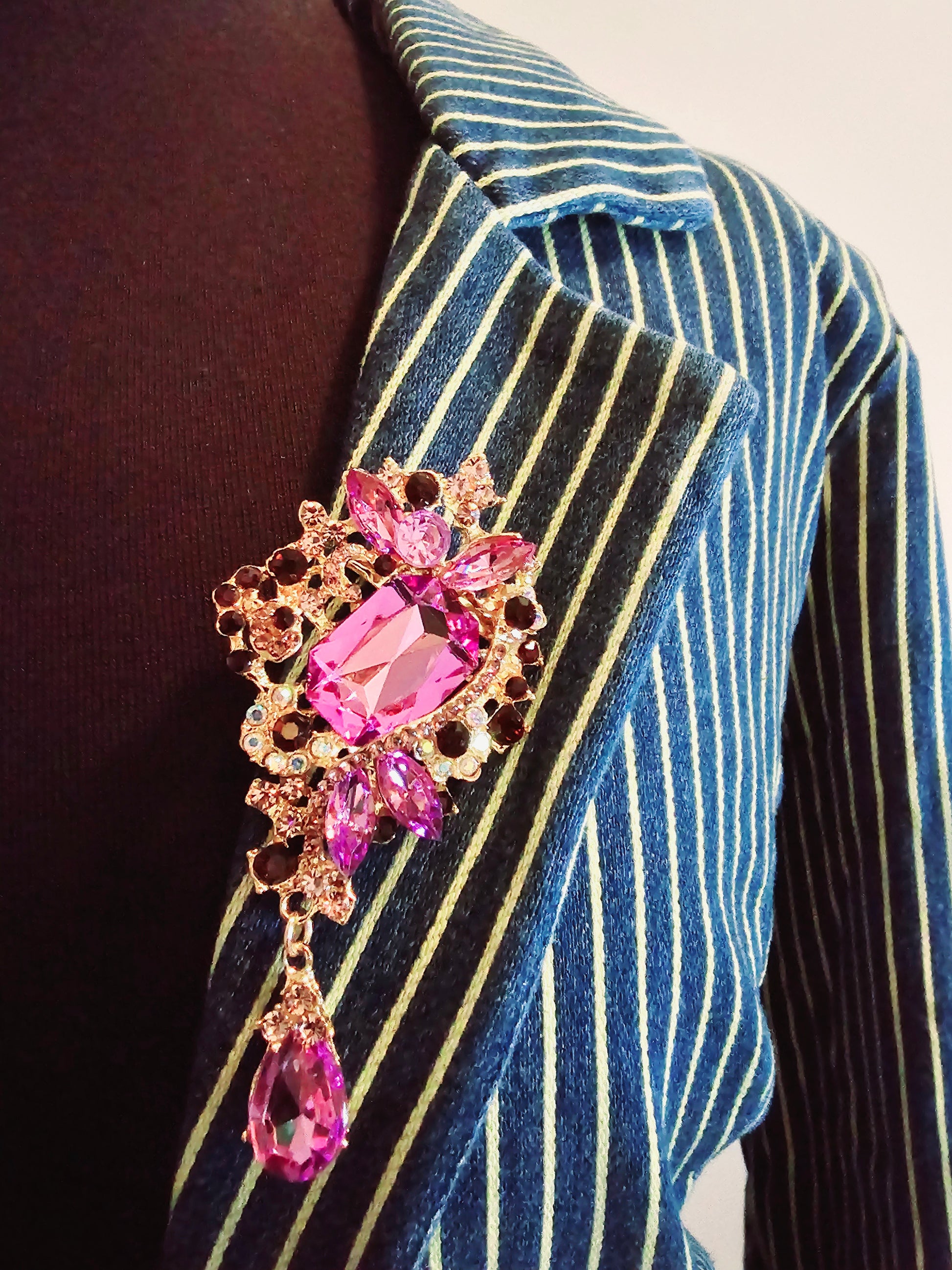 CRYSTAL PIN ATTACHED TO FRONT LAPEL, 2 FRONT