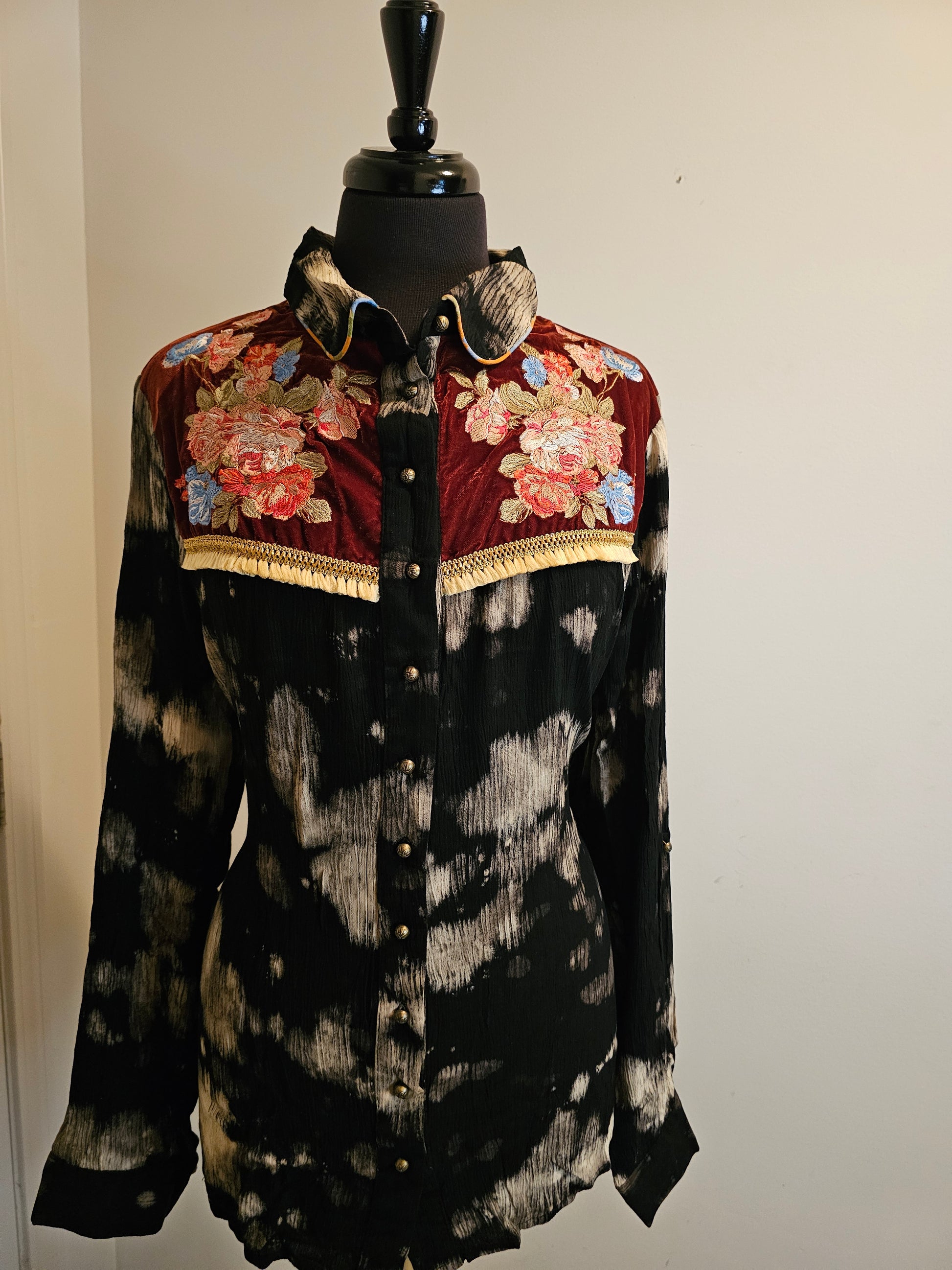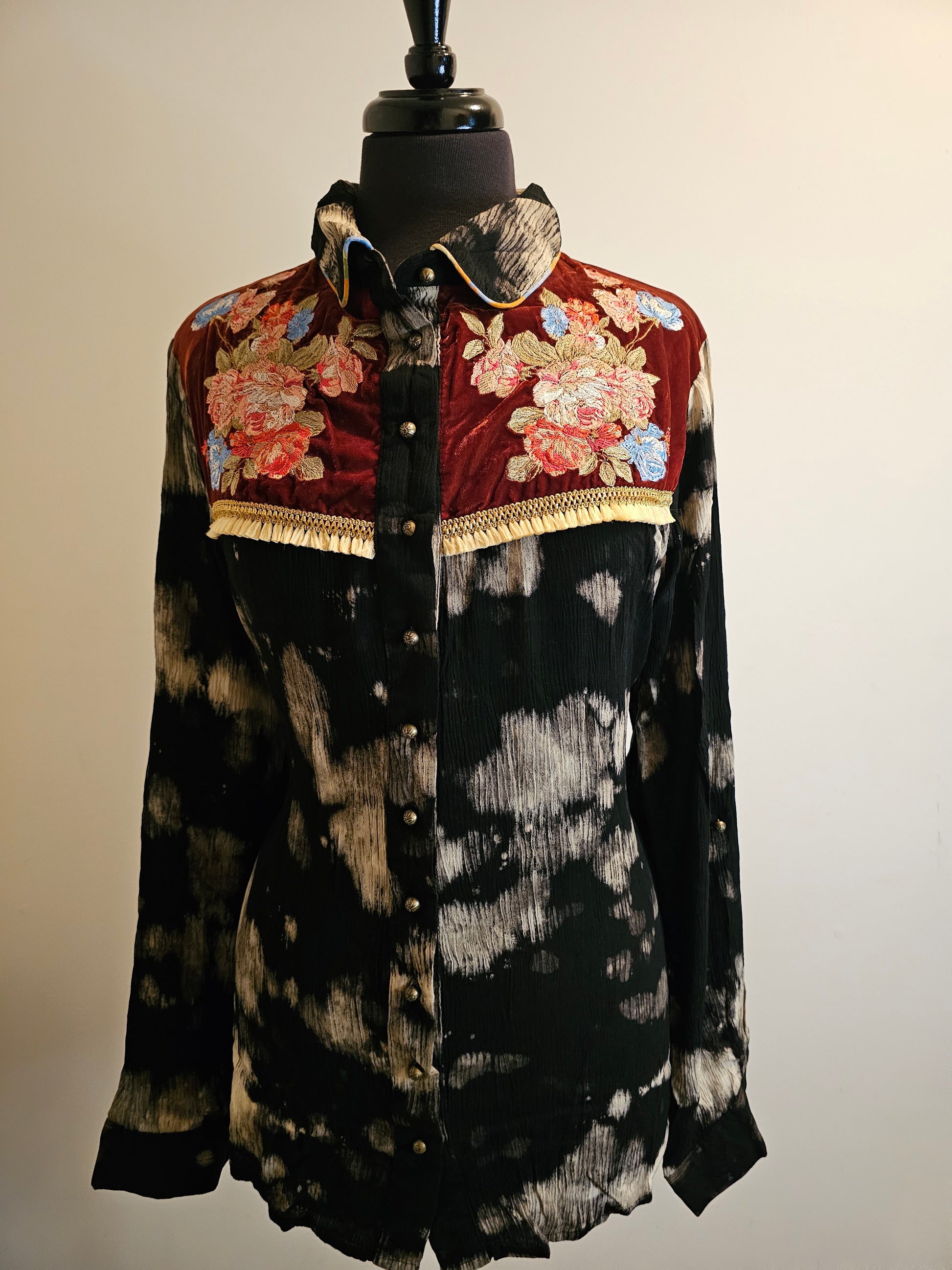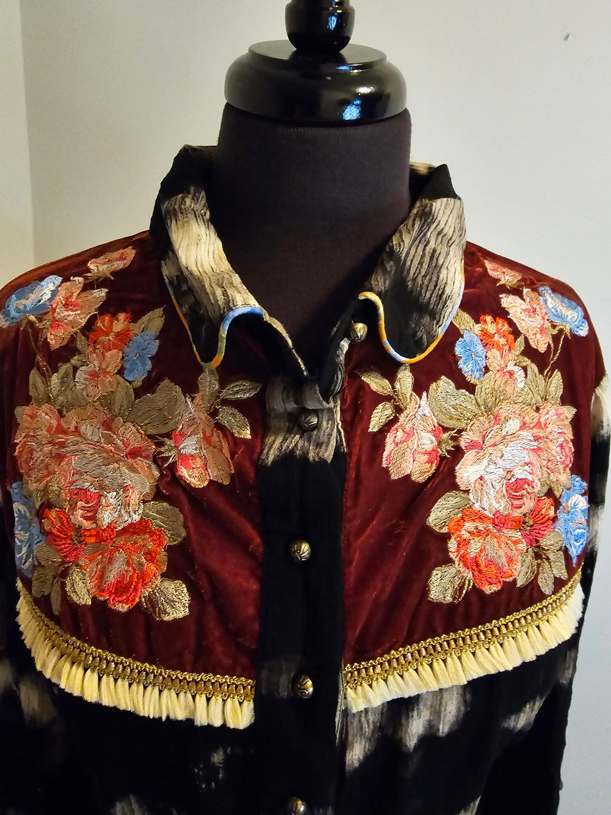 SELF FABRIC: 100% VISCOSE, YOKE: 100% POLY VELVET