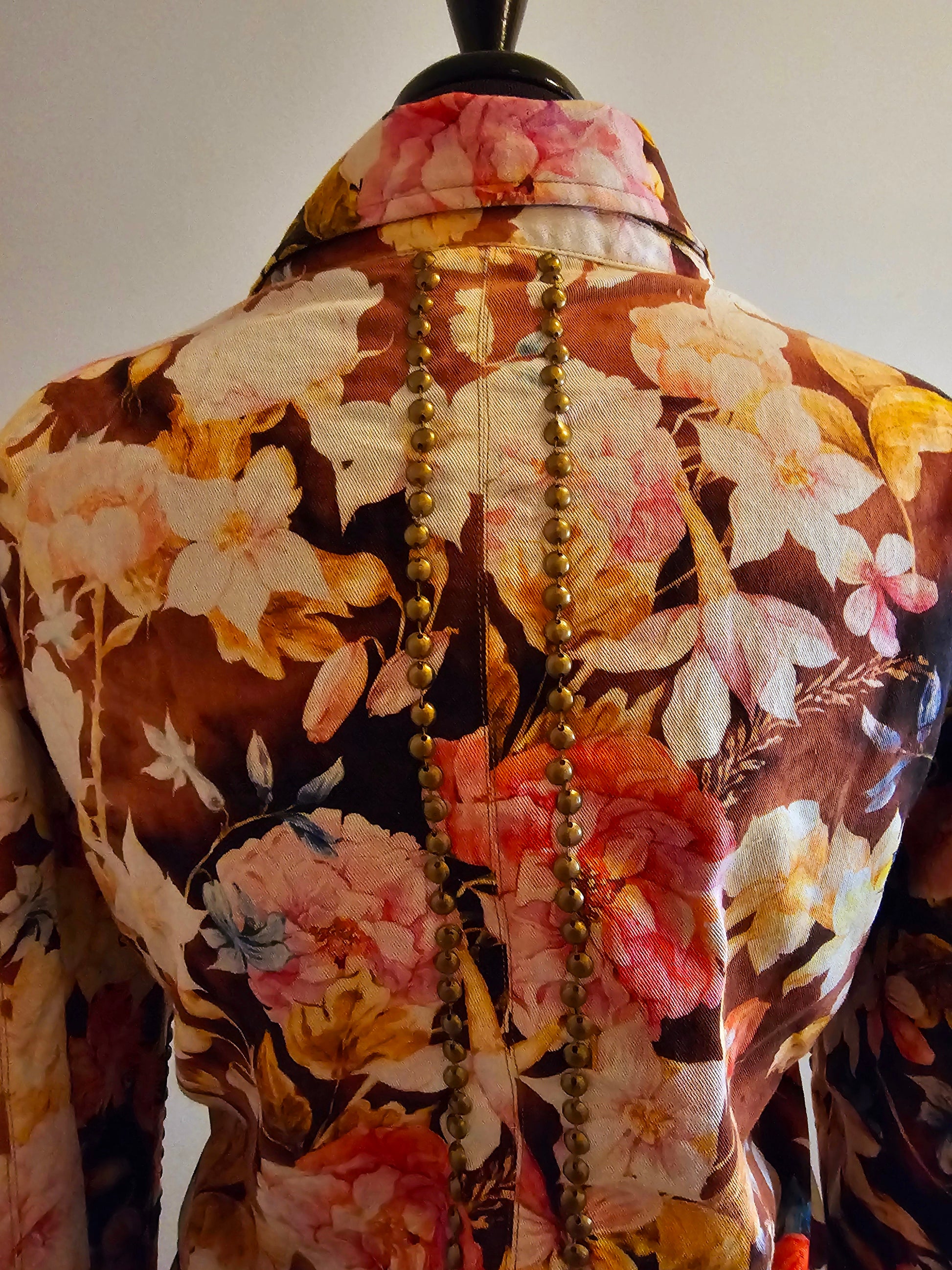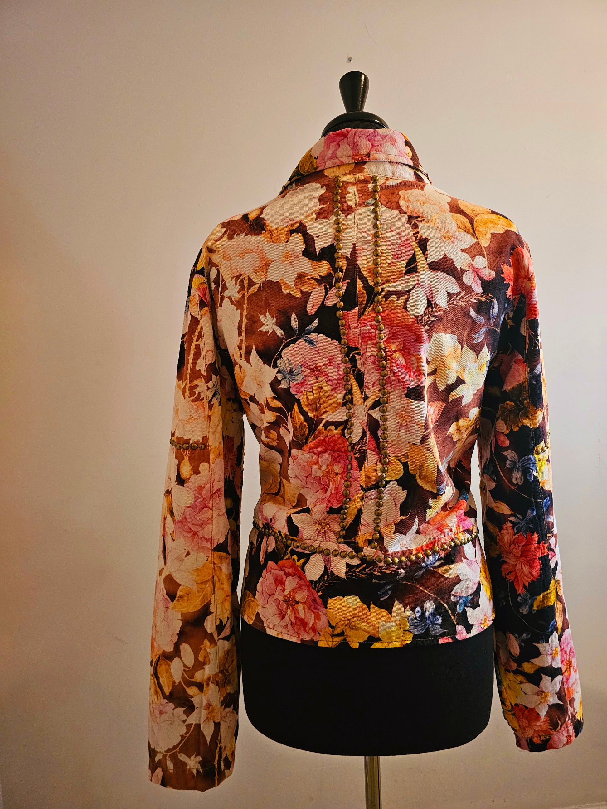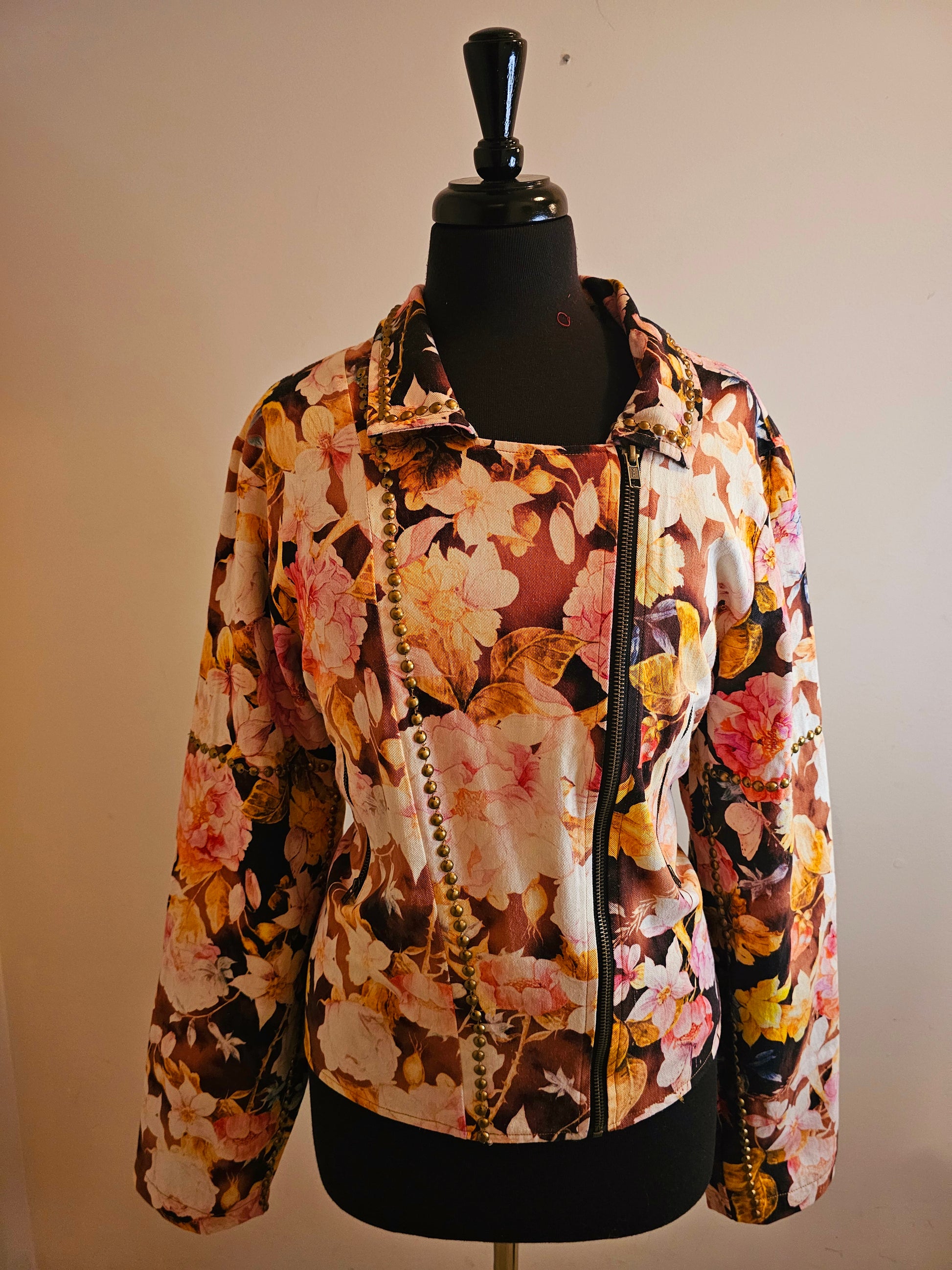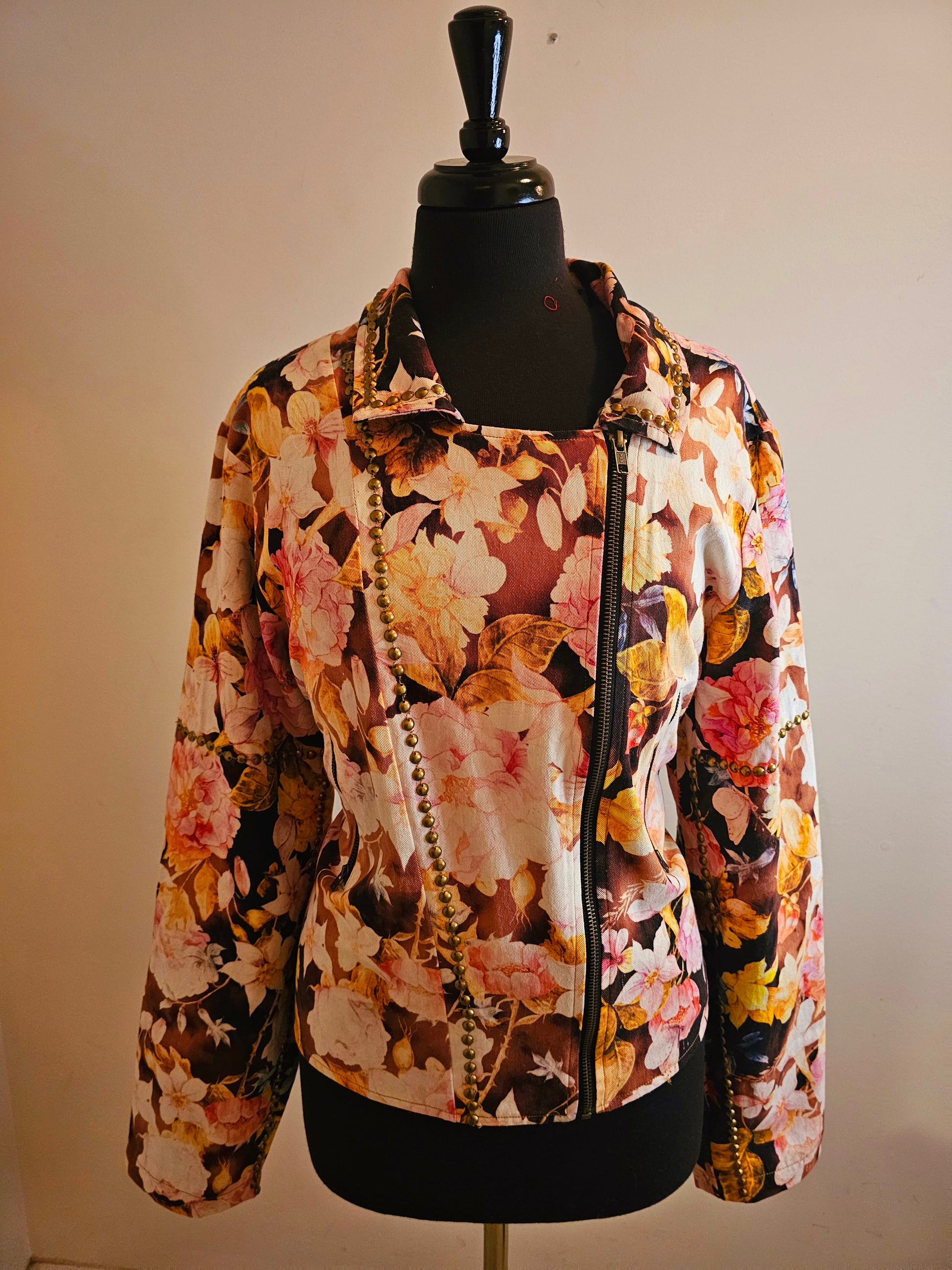 WASHED FLORAL PRINT DENIM MOTORCYCLE JACKET