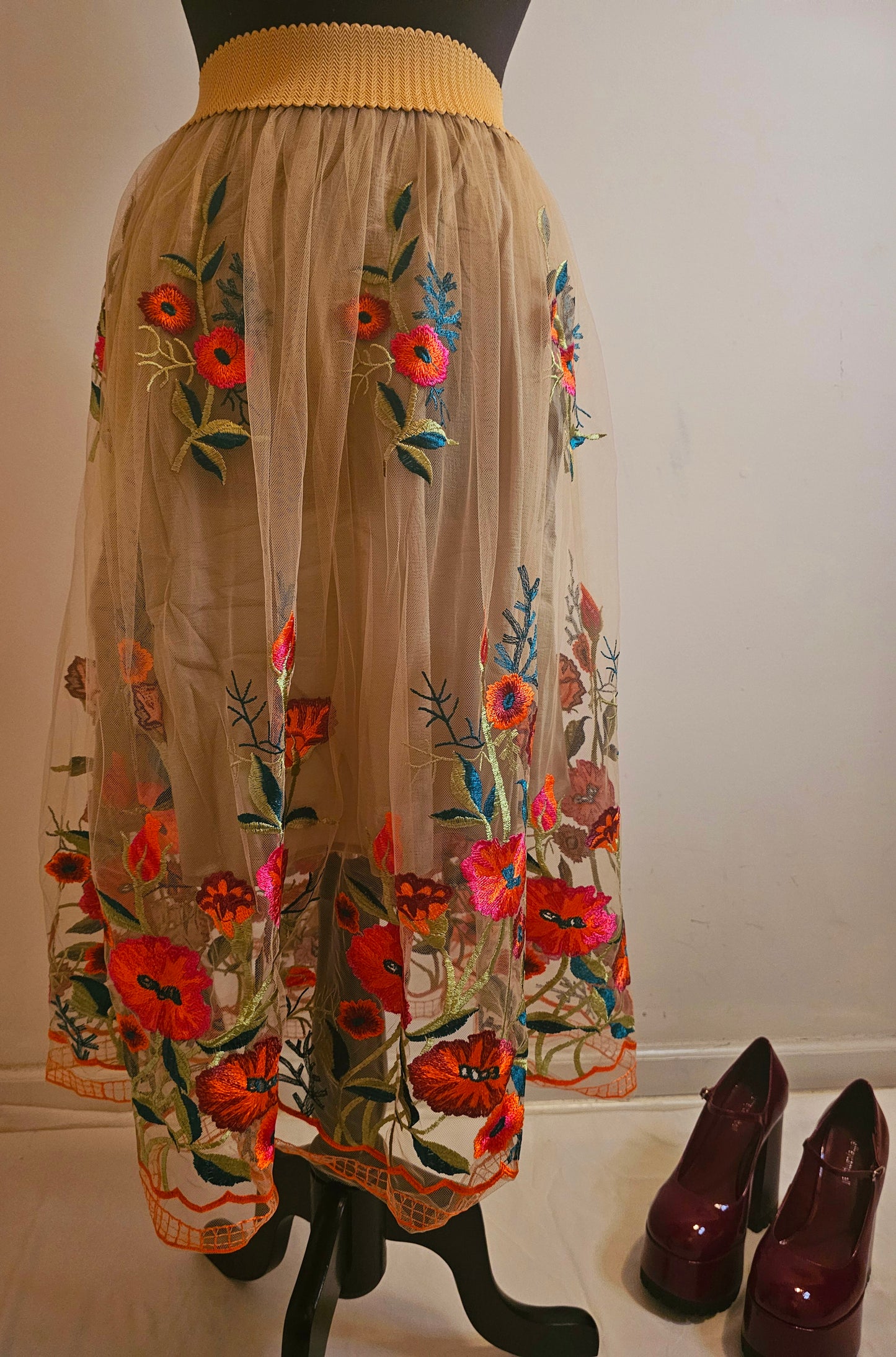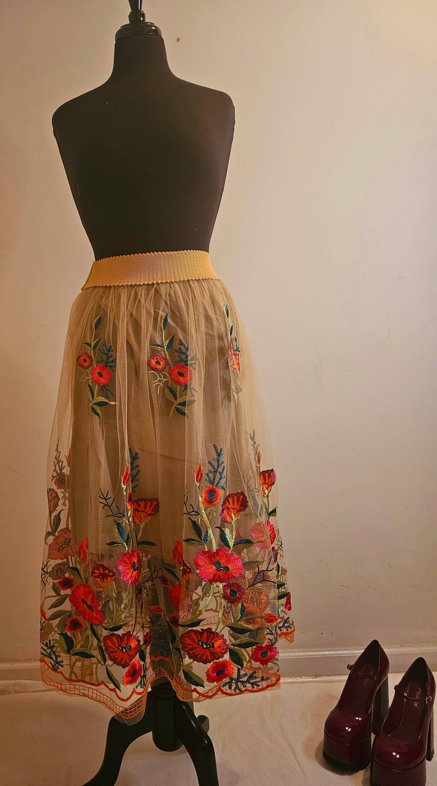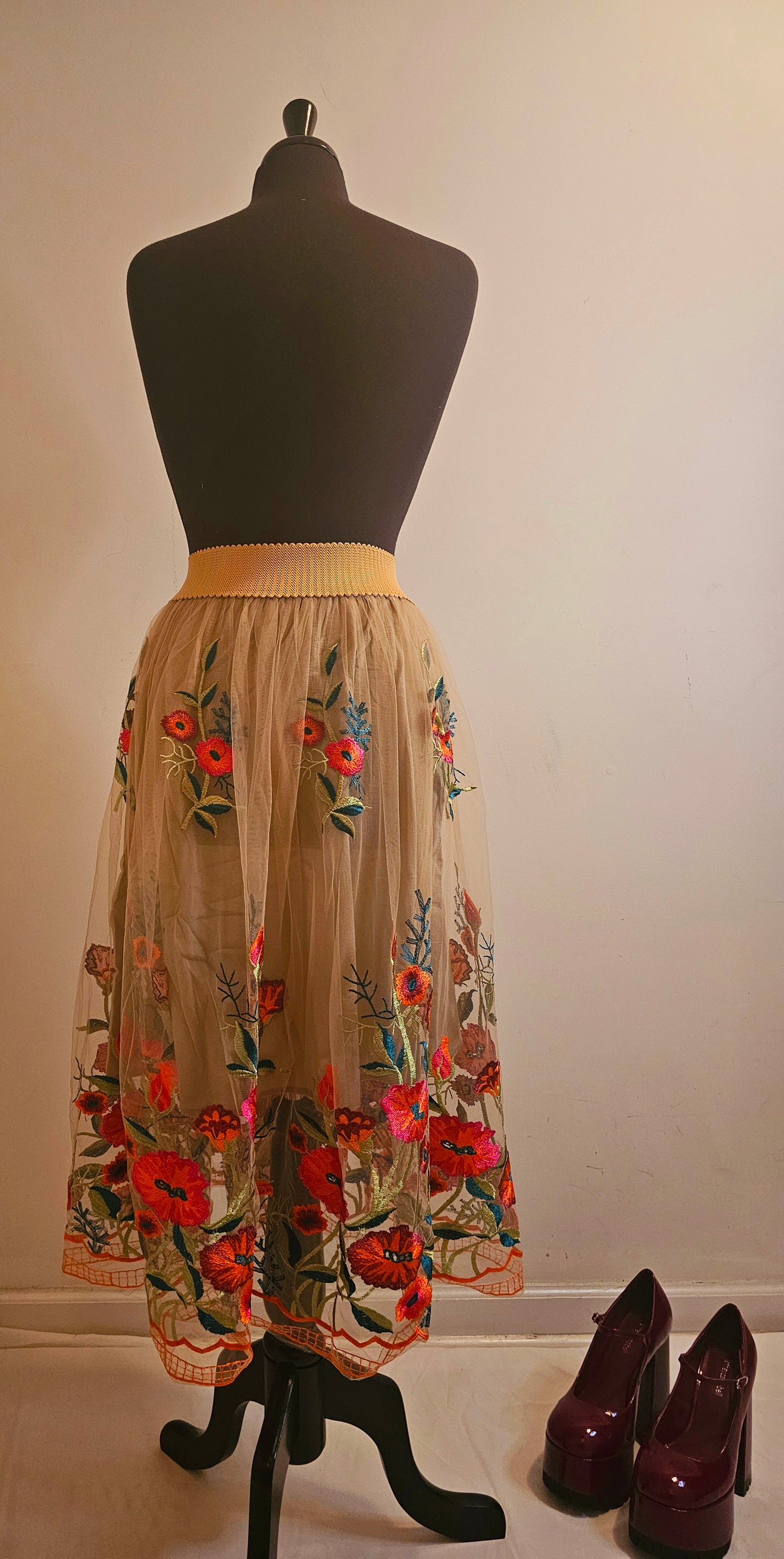 FLORAL EMBROIDERED MESH ELASTIC WAIST LINED